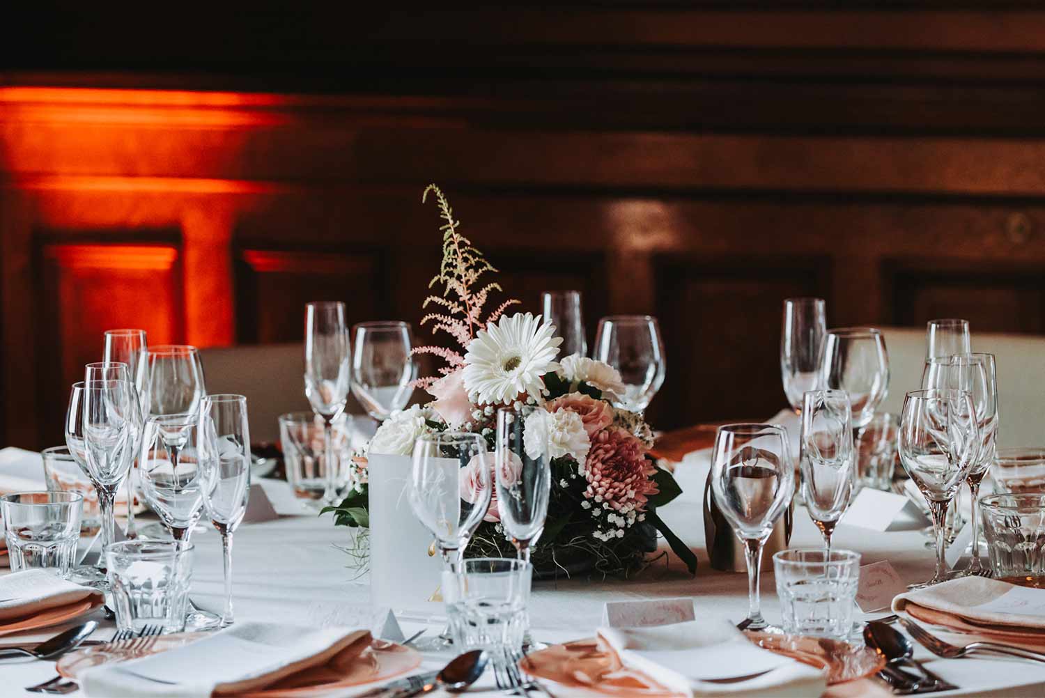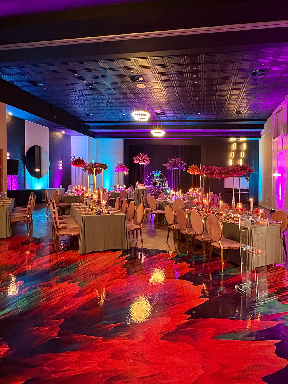 Color selection (tablecloths, chair covers, organza, drapes, lighting effects)